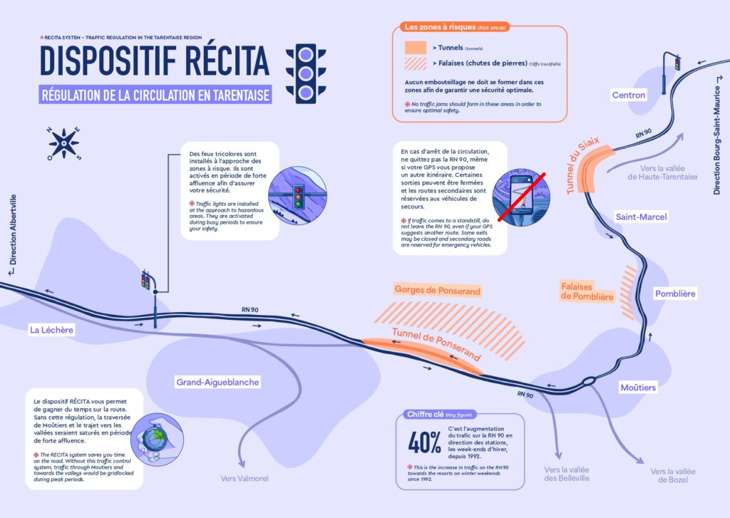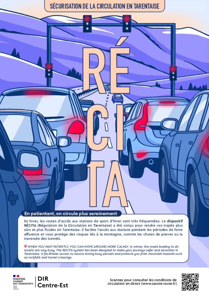 Dispositif RECITA – Accès routiers stations de Haute-Tarentaise Petit explicatif de RECITA, le dispositif de sécurisation des routes d’accès en Tarentaise entre Albertville et Bourg Saint Maurice.